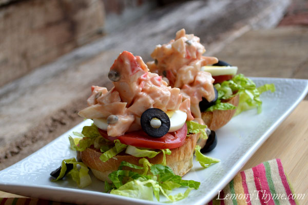 • Combine the dressing ingredients. Toss the crab meat in the dressing then layer the salad as follows: toasted roll, shredded lettuce, tomato slices, egg slices, olives, and dressed crab meat.