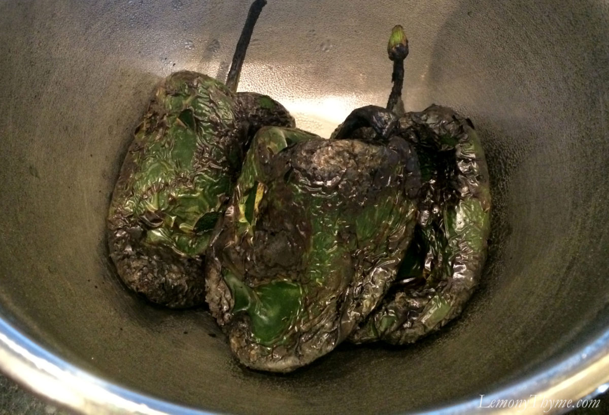 • Char poblano peppers over open flame or under broiler until blackened on all sides. Place in bowl and cover with plastic wrap. Allow to steam for about 10 minutes. Run peppers under cool water rinsing away blackened skin.