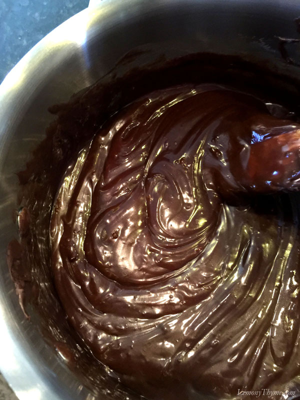 • In a medium saucepan, combine 3 cups of favorite chips (I used 2 cups of Dark Chocolate & Mint and 1 cup semi-sweet) with one can of sweetened condensed milk. Melt over medium-low heat.
