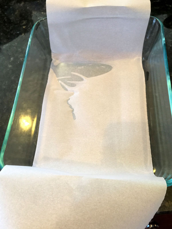 • Pour into parchment paper lined pan. Chill for two hours. Cut in squares to serve.
