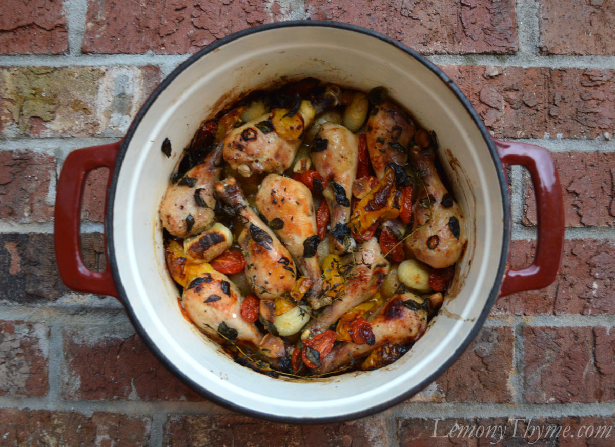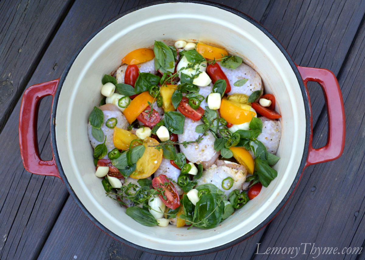 - Season chicken legs with salt & pepper. Arrange in the bottom of a large dutch oven. Nestle potato pieces around chicken, then add sliced tomatoes, basil leaves, lemony thyme, garlic cloves, and chili. Drizzle olive oil over top.