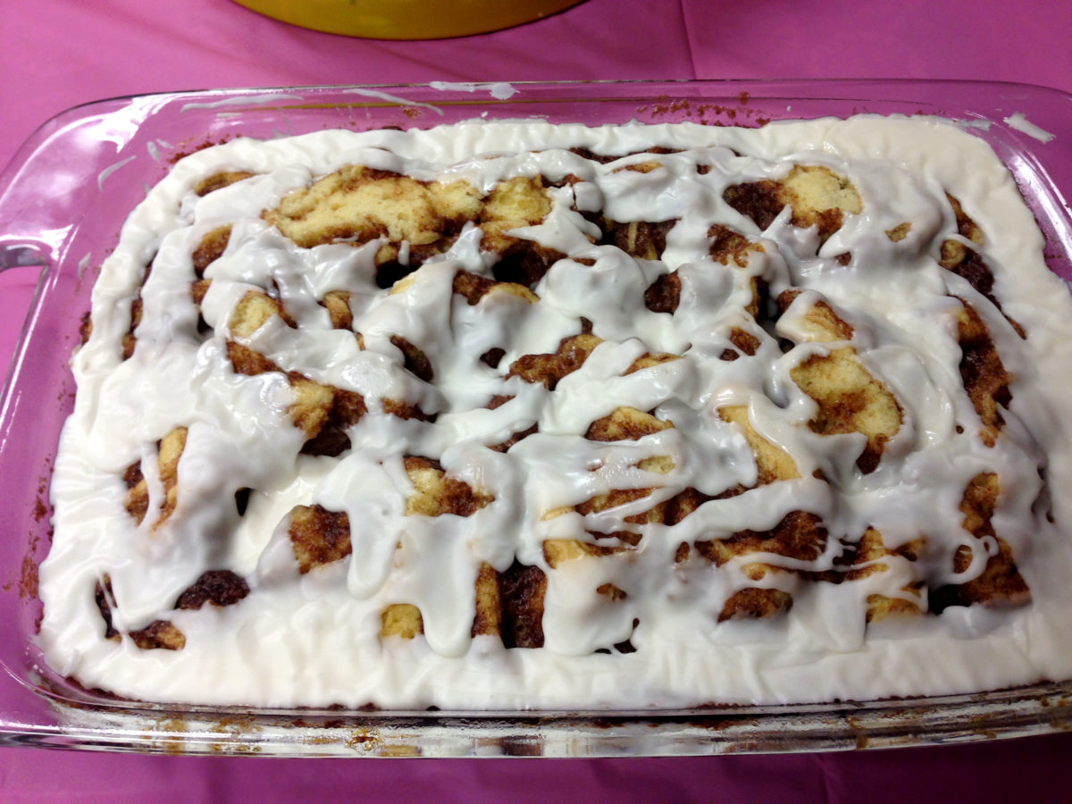 We had heavenly Cinnamon roll cake, deviled eggs, Eggo waffles with syrup, marshmallow eggs, and Pork Egg Fu Yung.
