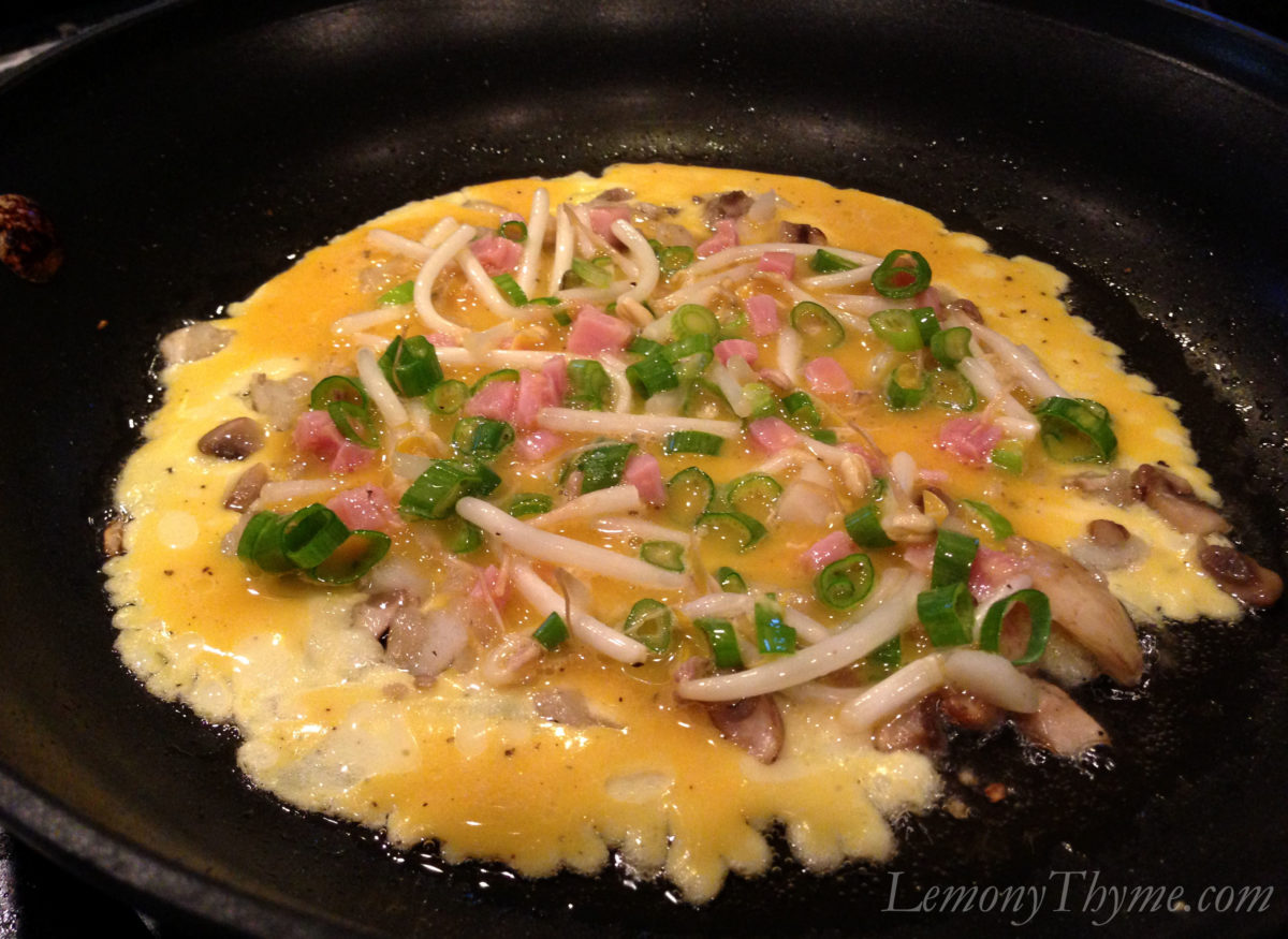 - In a medium bowl, sift flour into beaten eggs while whisking briskly. Whisk in soy sauce and sesame oil, then add in bean sprouts, diced ham, scallions, and black pepper.