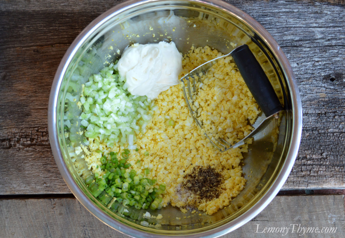 - Finely chop eggs. When you think they’re fine enough, chop them some more. Then add celery, scallions, mayonnaise, salt and pepper. Mix until well combined. Adjust seasoning as needed. Chill until ready to serve.