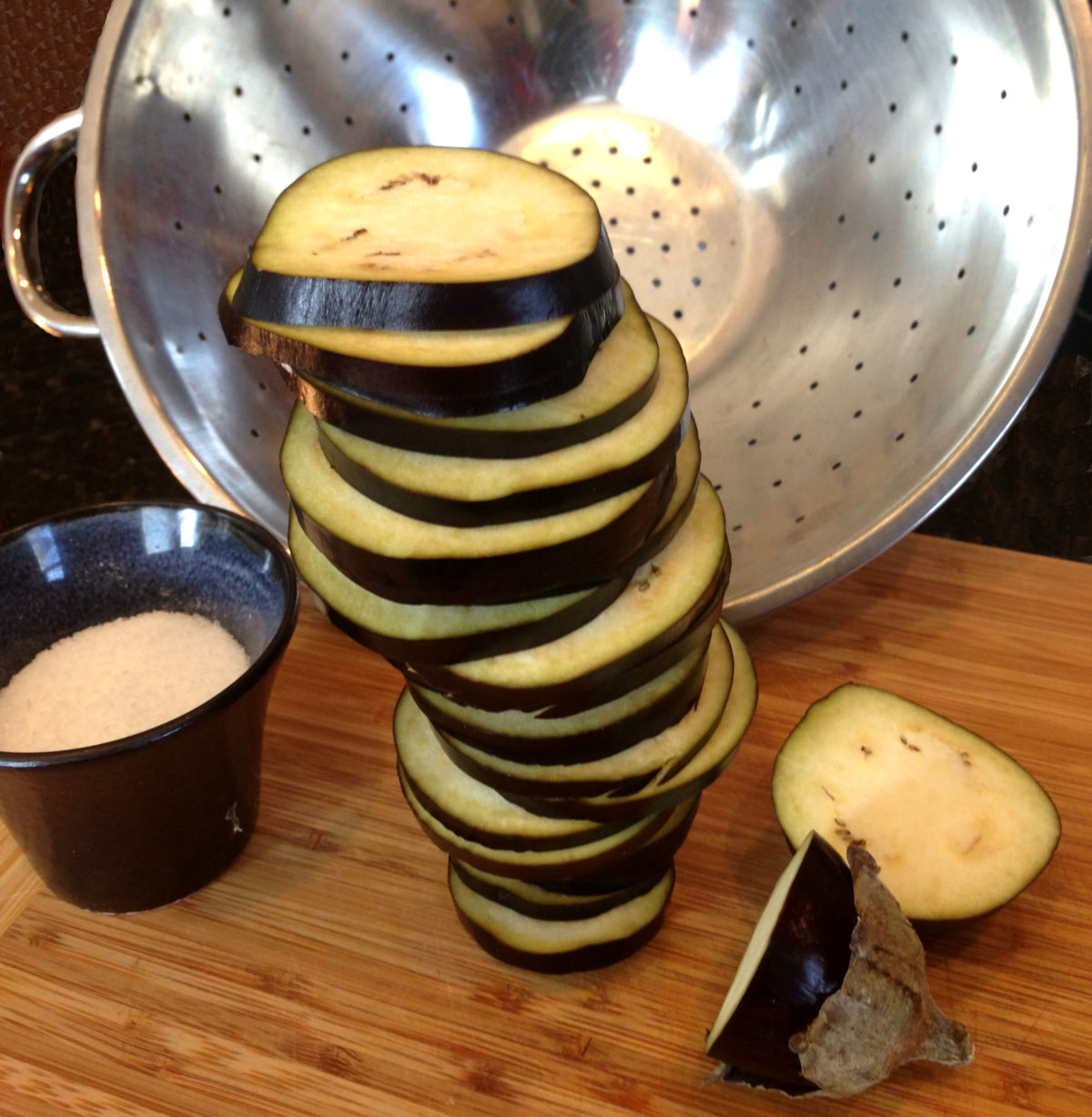 - Slice eggplant into 1/4″ thick slices, place in a single layer in a colander. Sprinkle with kosher salt and allow to sit for about 30 minutes. Rinse slices, then dry between paper towels.