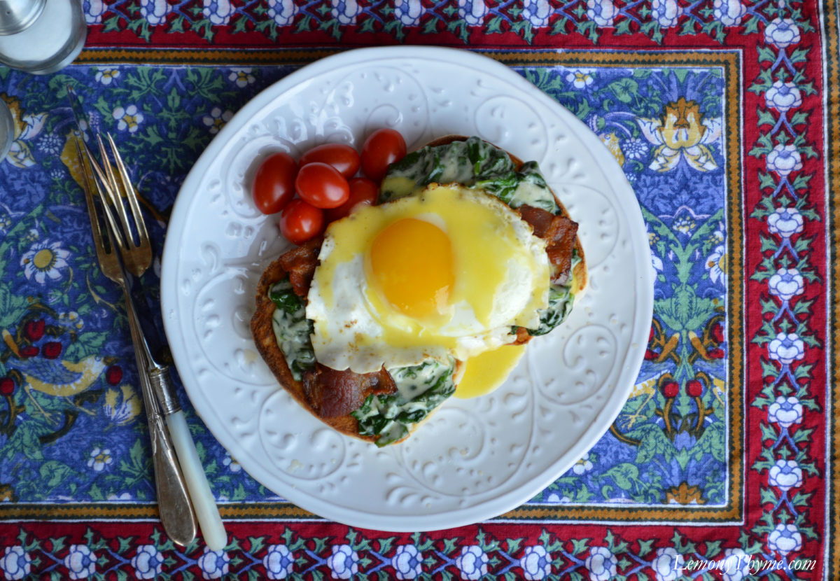 It’s with that little jingle stuck in my head that I present you a most delicious post-holiday breakfast treat. We served our Eggs Florentine with creamed spinach, crispy bacon, fried eggs and Hollandaise sauce. However béarnaise would be lovely as well.