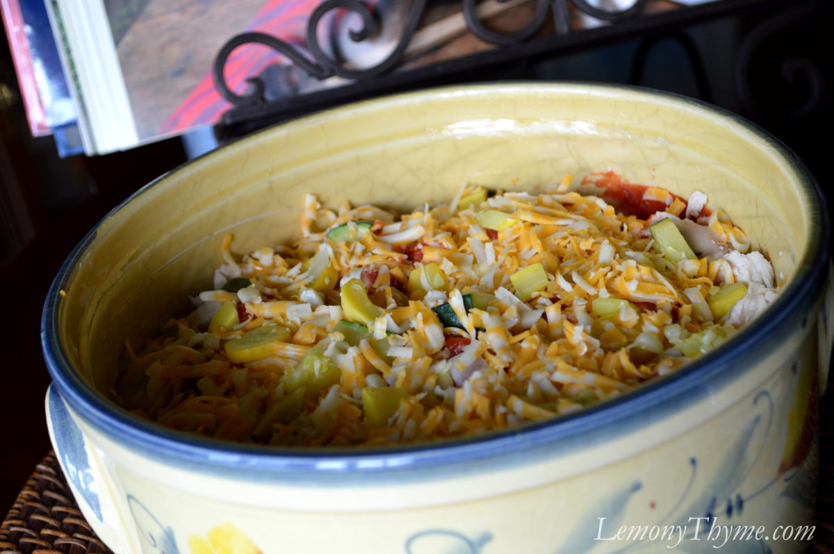 Once assembled the casserole is baked for 20 minutes or so until the cheese has melted and the ingredients are heated through. The squash, zucchini and corn are cooked until just crisp-tender maintaining their fresh from the garden flavor. I think that’s what I love most about this dish, well that and the fresh tomato sauce….along with the chicken and cheese. And I can’t forget the tasty surprise of finding layers of corn tortillas nestled amongst all this goodness.
