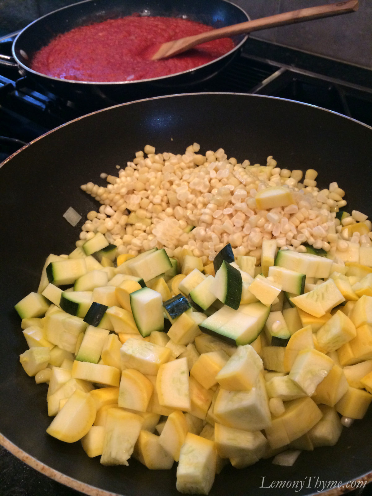 - Melt the butter in a large saucepan. Add the zucchini, summer squash and corn and cook for 2 minutes. Add the water; cover and cook for 8 minutes or until the zucchini is crisp-tender. Drain and set aside.