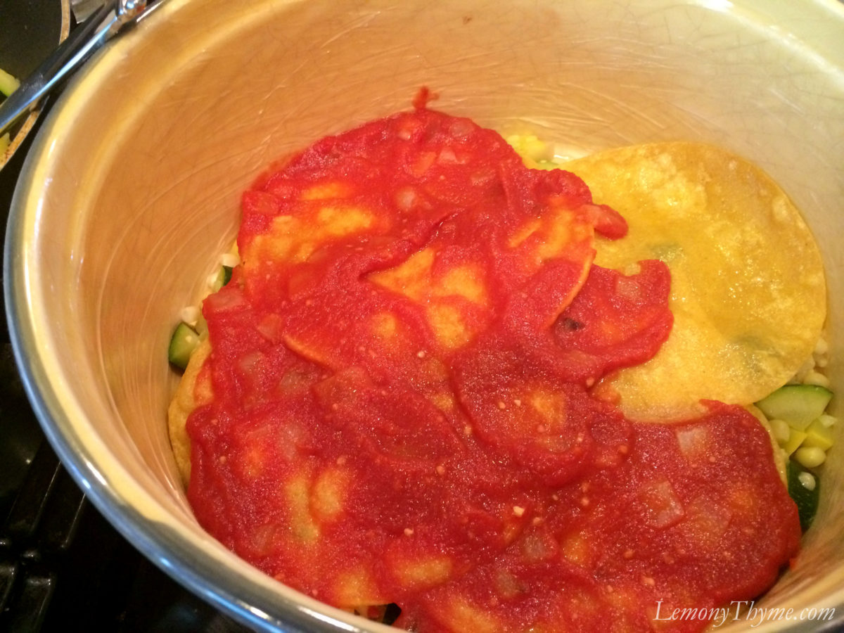 - Place a thin layer of vegetable layer on bottom. Top with a layer of 4-5 tortillas. Then add a layer of tomato sauce. Add half of the remaining vegetables, half of the poblano strips, 1/2 cup of the sour cream in dollops, half of the chicken and 3/4 cup of shredded cheese. Repeat layers finishing with the cheese.
