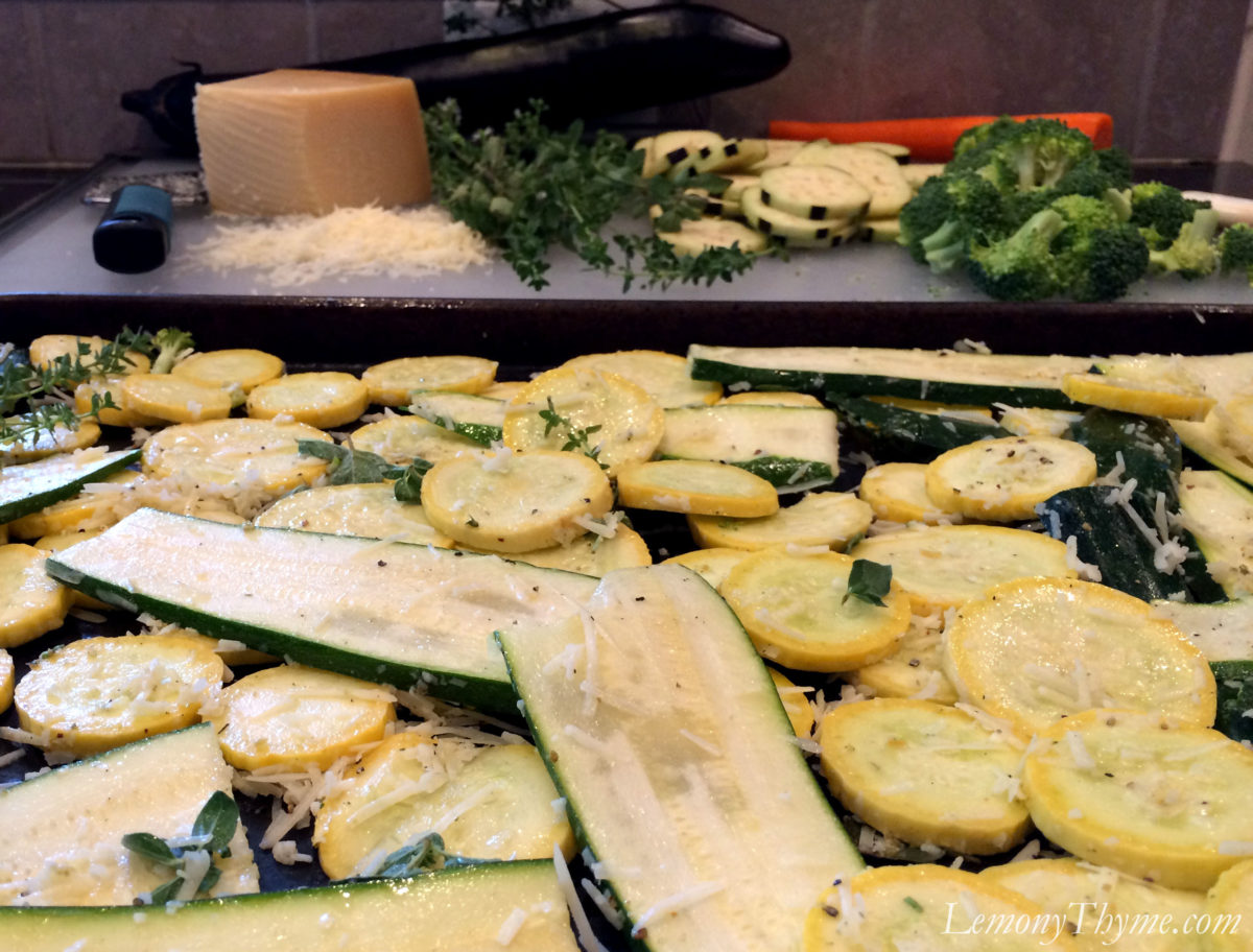- Preheat oven to 375 degrees. Cut veggies thinly or bite-sized, toss lightly with about olive oil, parmesan cheese, fresh herb sprigs, garlic & herb seasoning, salt & pepper. Then spread onto two shallow baking sheets and bake for about 30 minutes, or until tender. Reserve. Can be done a day ahead.