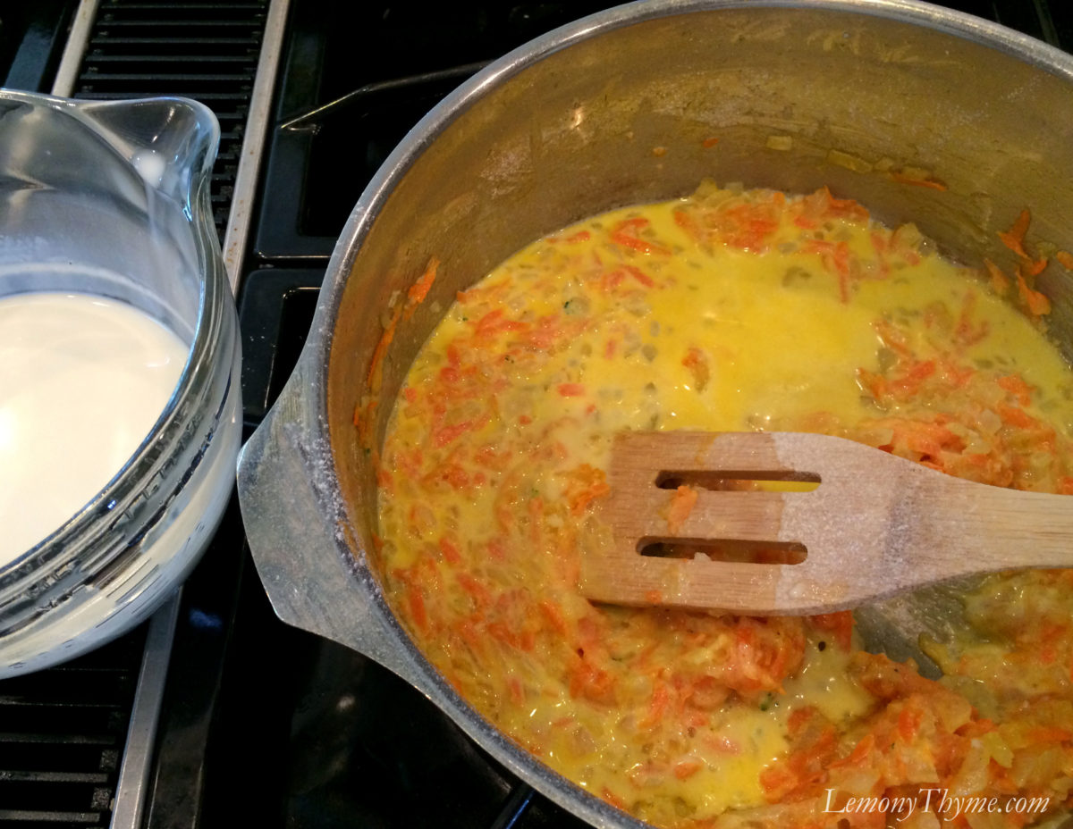 - Sauté carrots and onion in butter for 5-7 minutes over medium heat. Then dust with flour, stirring constantly. Once fully incorporated and bubbly, slowly whisk in milk/cream, stirring constantly. Sauce will thicken when it comes to a ‘gentle’ boil. Remove from heat, add in 1 cup parmesan cheese and red pepper flakes; whisk until melted. Reserve.