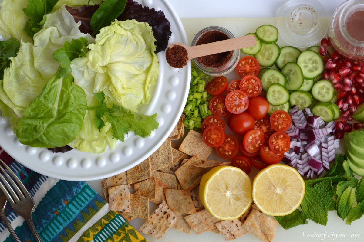 I was working hard to use ingredients already on hand. I may be a bit out of control. Pantry and freezer doors are…busting. So I went on offense and typed pita, lettuce, mint, tomato into my search engine field.