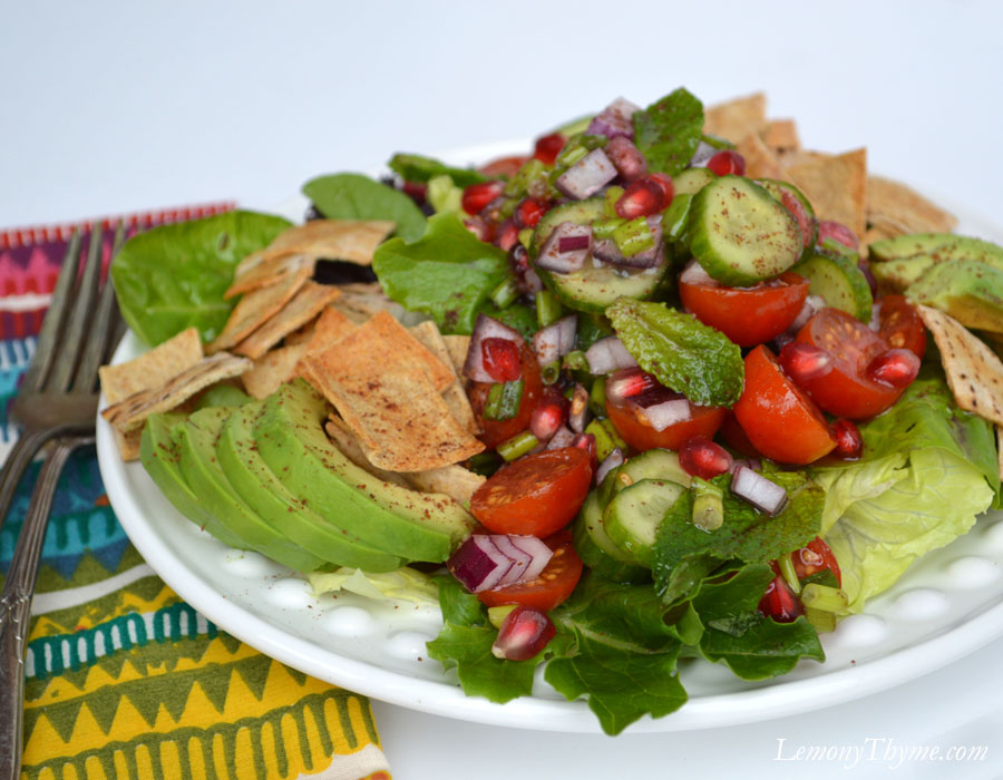When my search engine returned images of Fattoush…it was love at first site. Trust me. This salad is so deliciously flavor packed. I made a pomegranate sumac vinaigrette using pomegranate juice, lemon juice, ground sumac berries, and olive oil. If you’re not familiar with sumac, it’s a dried berry that’s ground and used in many Middle Eastern dishes. I was first introduced to it at Rumi’s Persian Kitchen, where we sprinkled it over our dishes. It is also available from the great people at Penzey’s Spices.