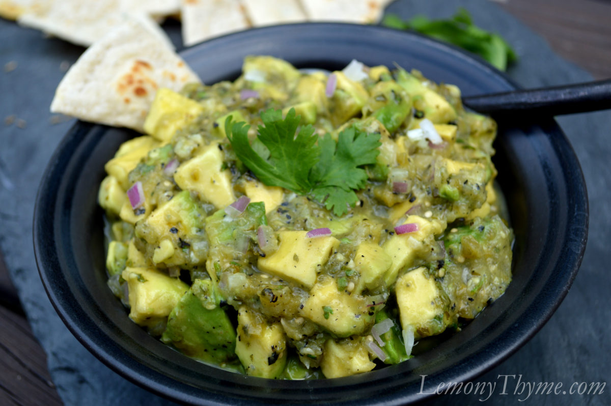 Months and months ago when I was doing a little research on tomatillos for my Salsa Verde recipe, I ‘bookmarked’ a recipe for Fire Roasted Tomatillo Guacamole.