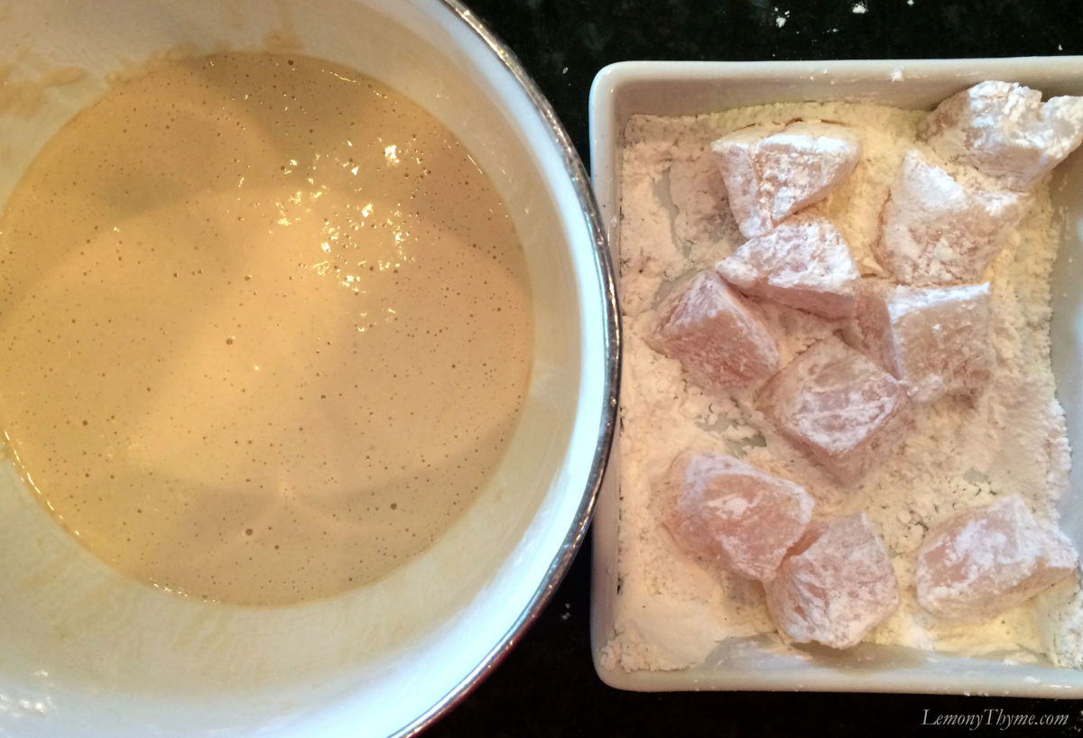 Our simple beer batter consisted of flour, corn starch, baking powder, salt and beer. I wanted it to be light but also reminiscent of classic beer battered fish & chips.