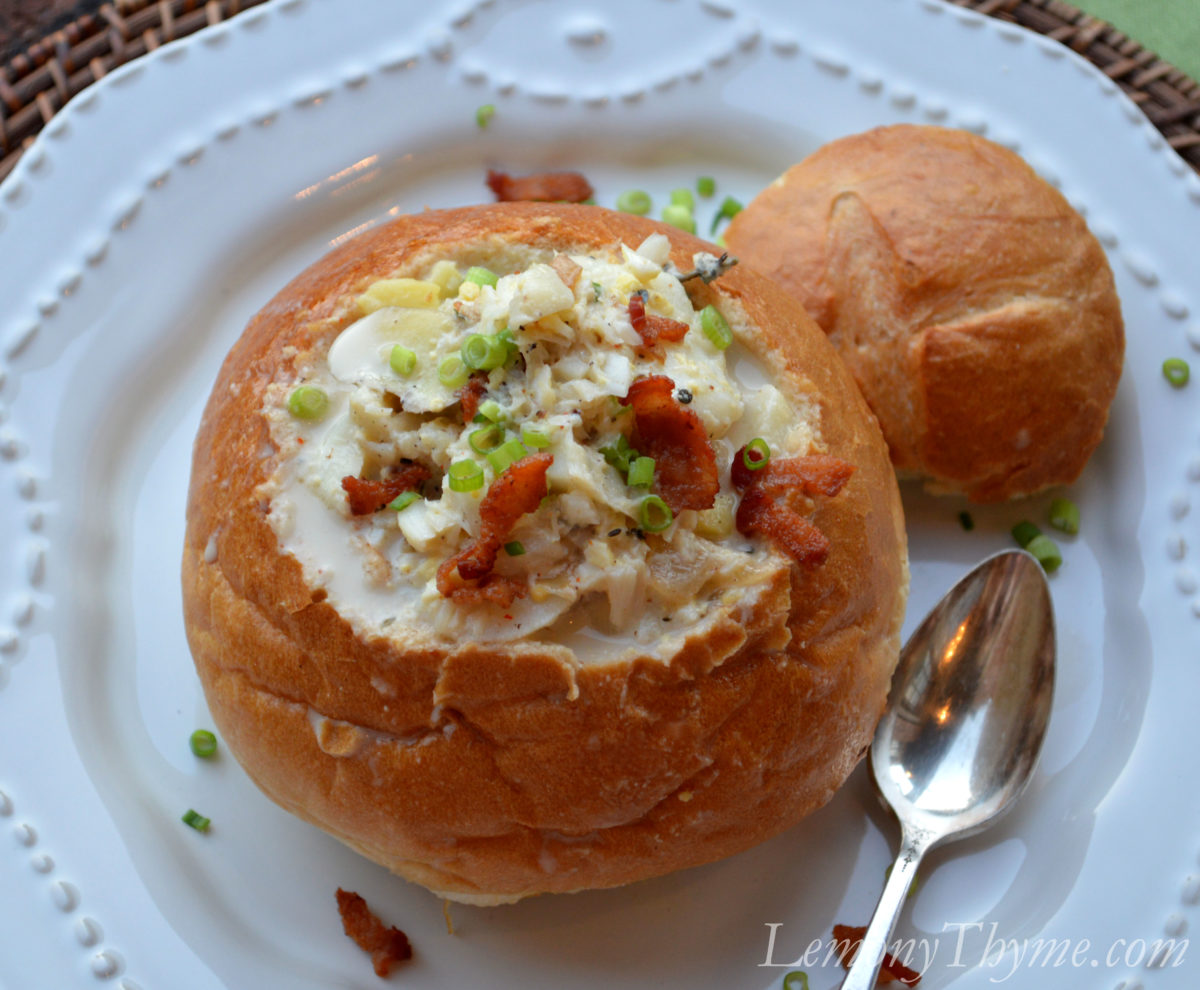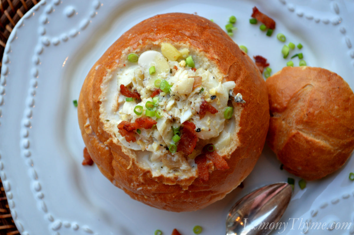 Fish Chowder served in Bread Bowls. <—- click here for Bread Bowl recipe.