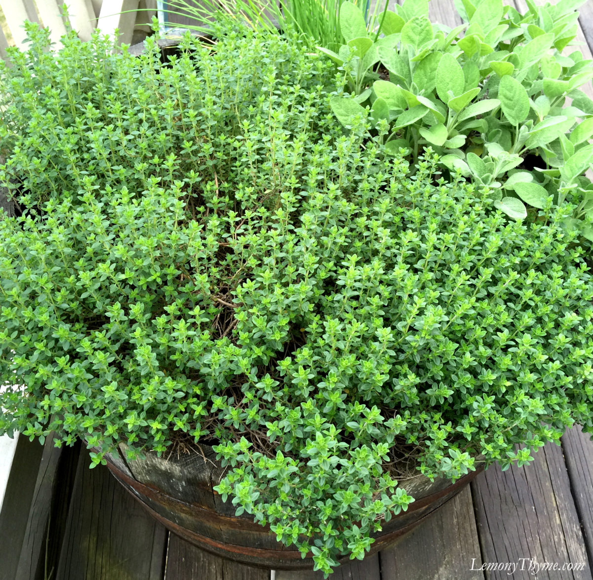 This is my #1 Whiskey Barrel Herb Porch Pot. Lemony Thyme is thriving and her sister Sage isn’t too shabby either.