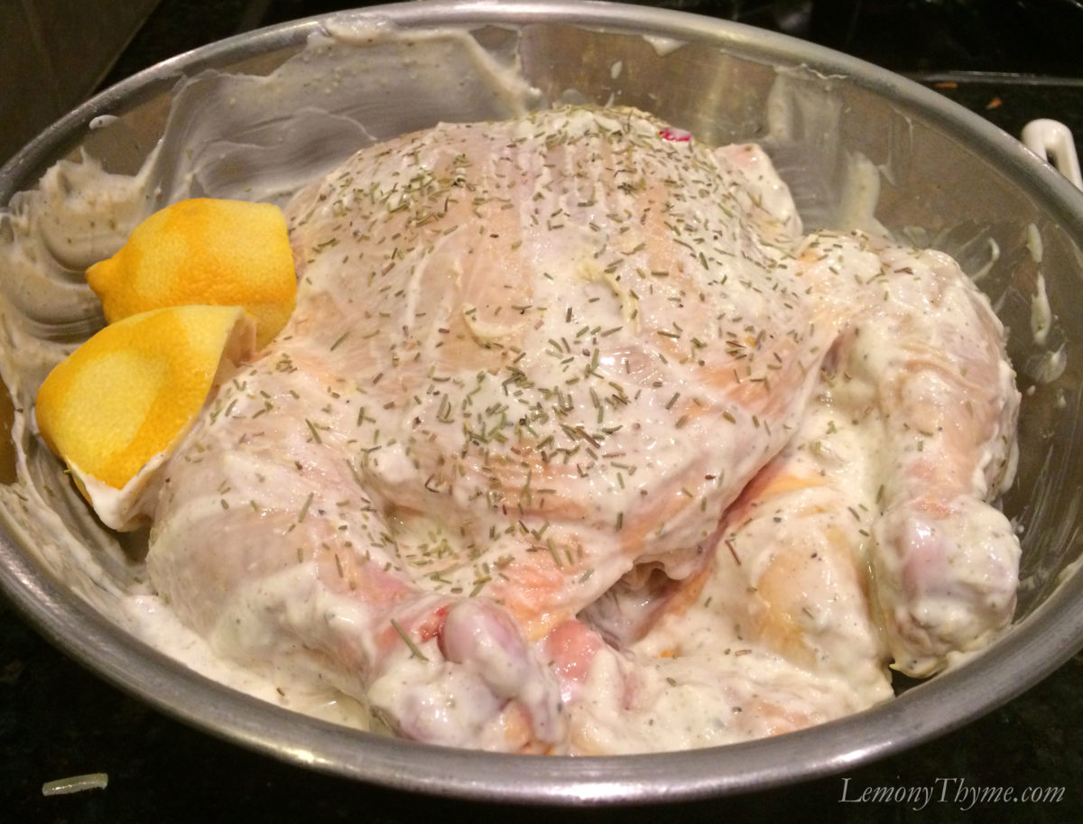 It starts with a punchy marinade of plain Greek yogurt, olive oil, lemon juice & zest, oregano, rosemary, Mrs. Dash garlic & herb seasoning, salt & pepper. The first time we made this dish we let it hang out in the marinade for a couple hours before roasting. It was delicious. In fact, that led us to make Lemon, Tortellini & Meatball Soup from the glorious homemade broth that followed.