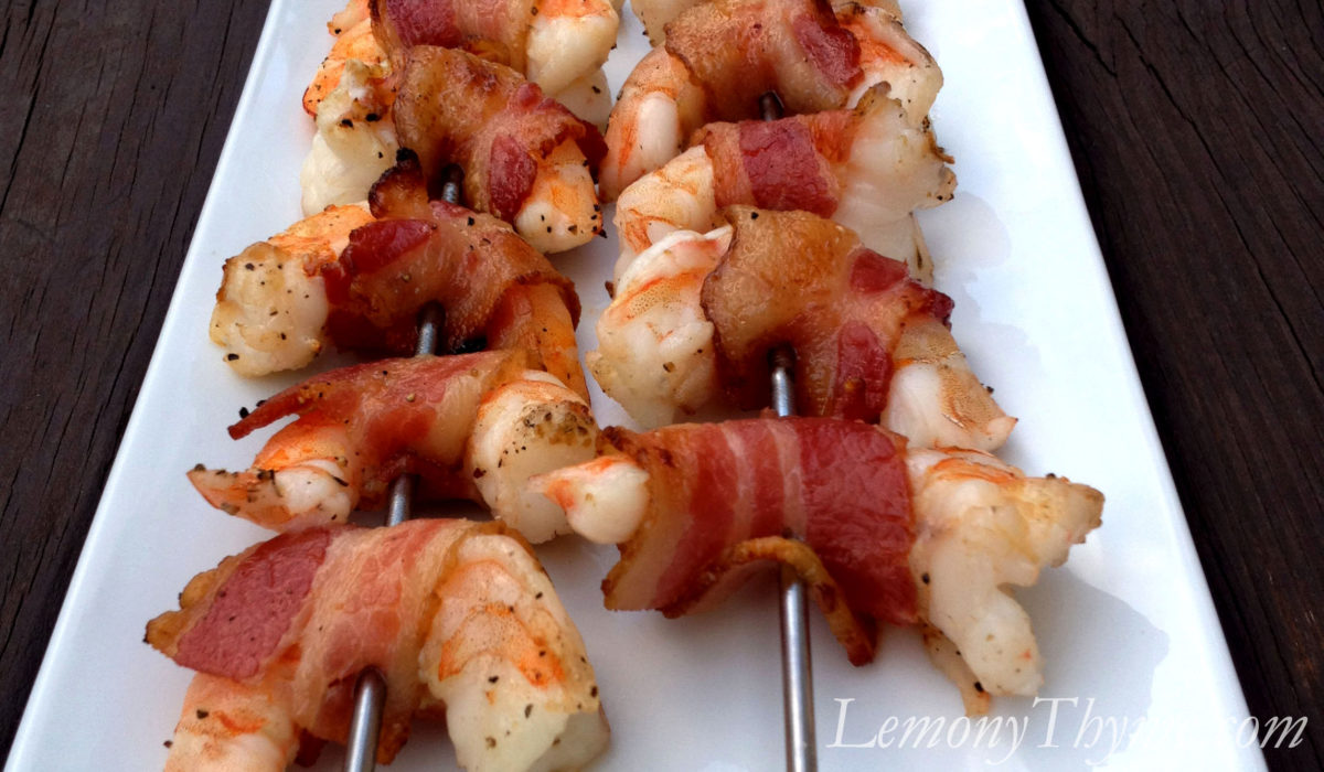 Two things you can generally find in our freezer are bacon and shrimp. Bacon because we use it to add flavor to many dishes, but don’t often eat it as…well bacon. We keep frozen shrimp on hand for easy week night meals or in case we’re invited to an impromptu gathering and need a quick & tasty appetizer. Grilled Bacon Wrapped Shrimp is just that. We’re open to invitations.