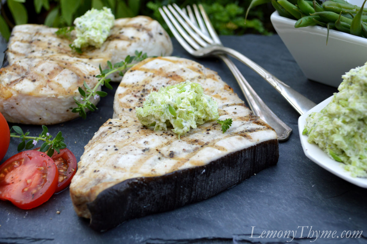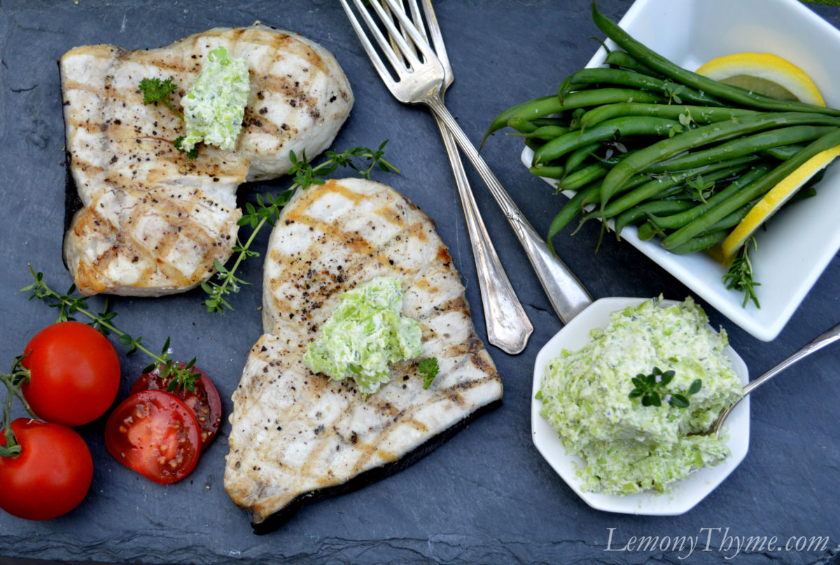 Grilled Swordfish with Lima Bean & Herb Butter.