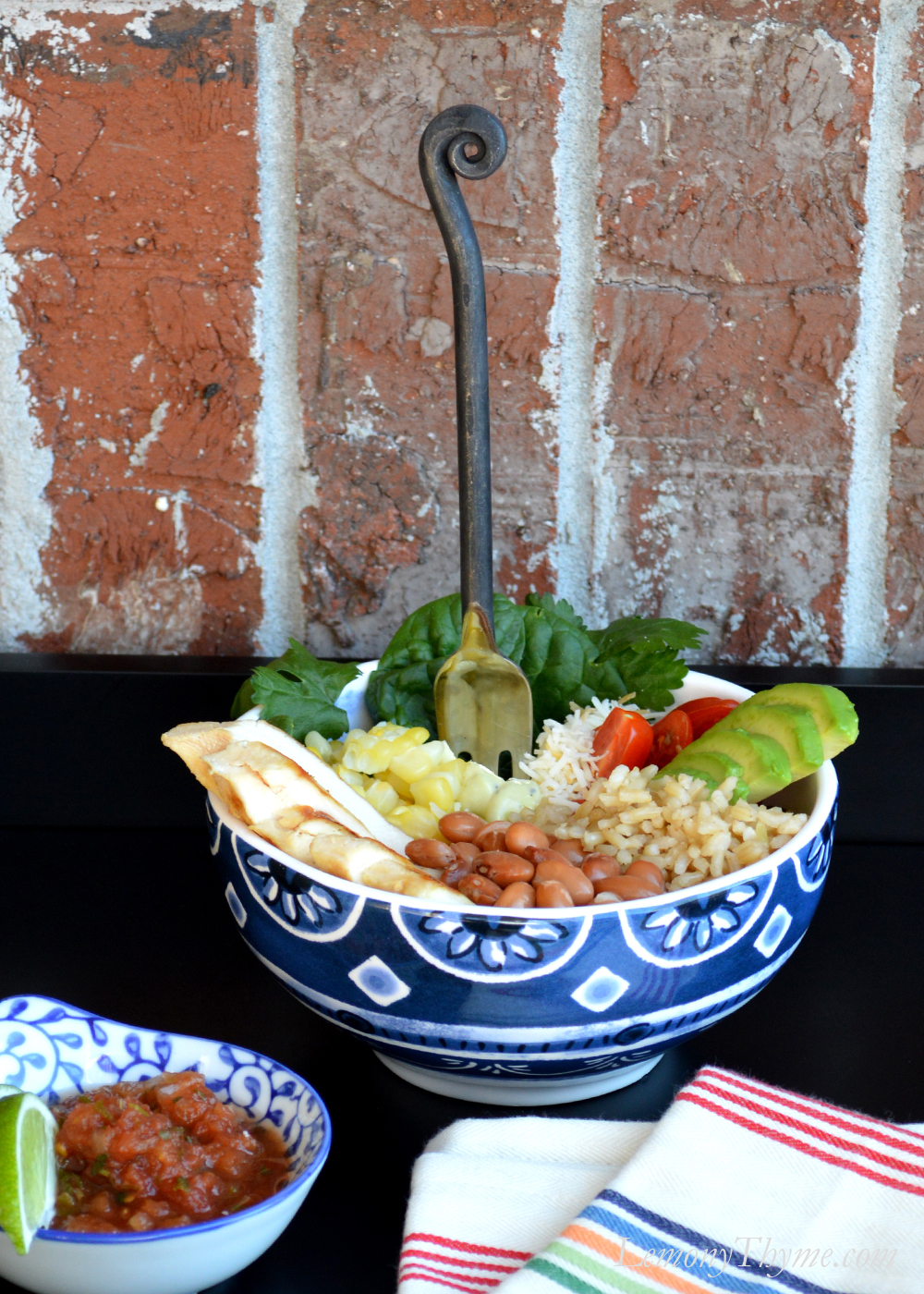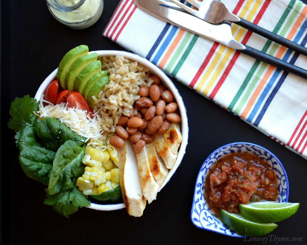 Healthy Southwest Burrito Bowl with grilled chicken, pinto beans, brown rice and lots of veggies.