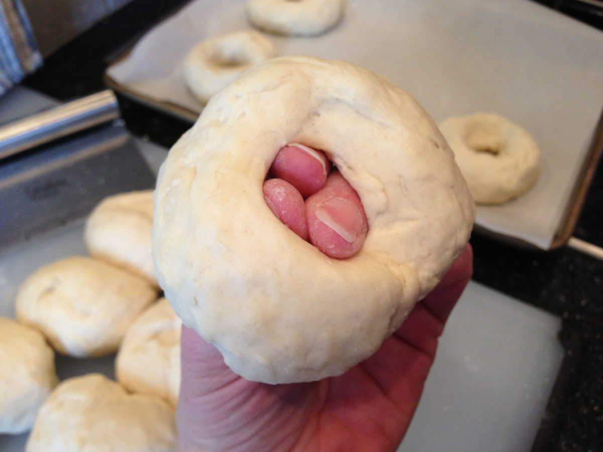 - Line two sheet pans with parchment paper and lightly mist with cooking spray. Shape the bagels by gently pushing a hole through the center, then stretching the hole to 2 inches. Return bagels to the sheet pans, spacing them 2 inches apart. Mist them with cooking spray then loosely cover with plastic wrap. Let proof at room temperature for 20 minutes.