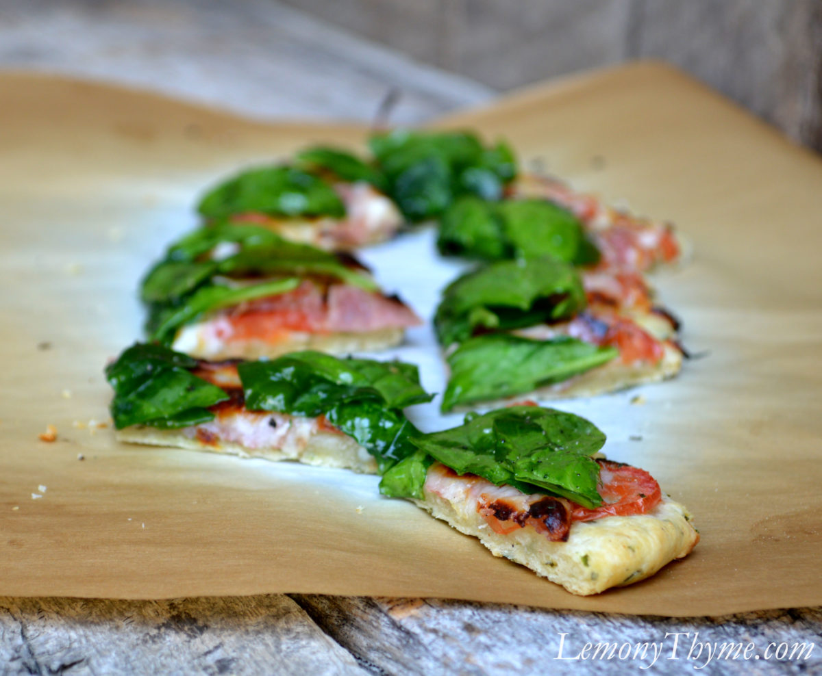 It’s inventory week at my office and considering I only got home from work 45 minutes ago, we topped our flatbread pizzas with simple ingredients straight from the fridge. For the crust, we made the parmesan garlic & herb version and prebaked them for 4 minutes. We then topped them with sliced tomato, salami, mozzarella cheese, spinach and a drizzle of olive oil. Another 6-8 minutes in the oven until cheese was melted and bubbly.