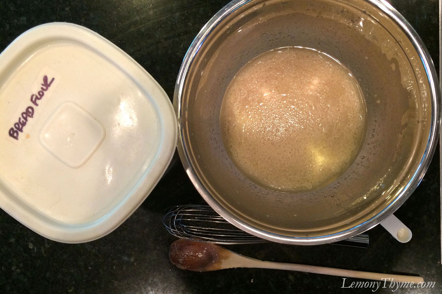 - In a large bowl dissolve yeast in warm water. Whisk in vegetable oil and sugar. Allow to rest for 5-minutes.
