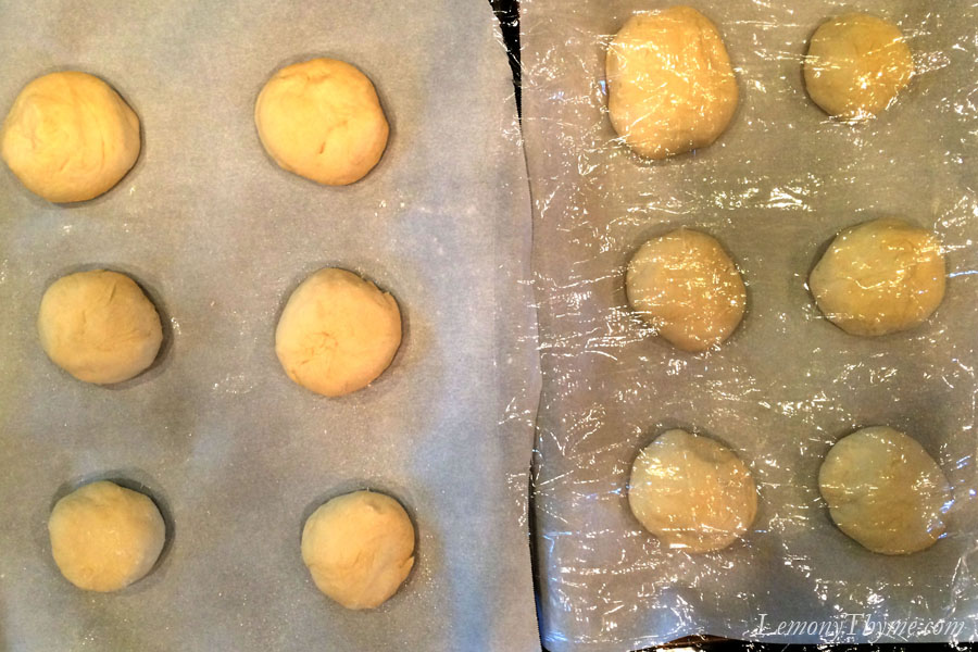 - Turn out onto a well floured surface and knead for 3-5 minutes until smooth and elastic. Divide into 12 balls. Do not allow to rise. Place 3-inches apart on parchment lined baking sheets, cover and allow to rest for 10 minutes.