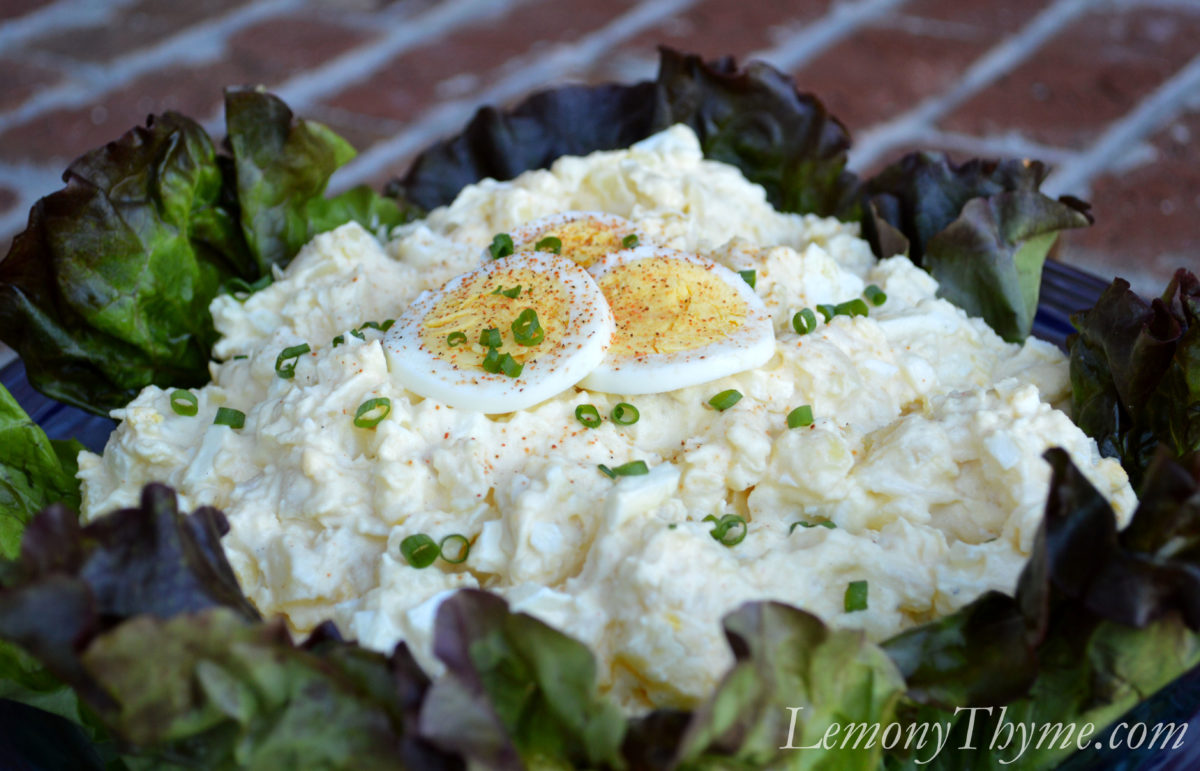 - To serve, line serving bowl with leafy lettuce leaves. Scoop in potato salad. Garnish with sliced hard boiled egg, scallions and a sprinkle of cajun seasoning.