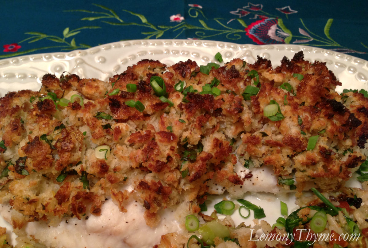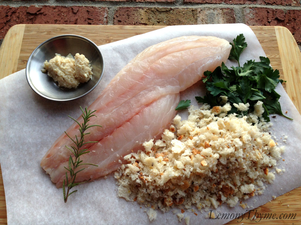 To prepare the Grouper, sprinkle both sides of the fillet with salt and pepper and set aside. For the topping, make two cups of fresh bread crumbs out of crusty day-old bread. Toss crumbs with 3-4 tablespoons of chopped flat leaf parsley, 1/2 teaspoon of minced fresh thyme and rosemary. Add 2 generous tablespoons of prepared horseradish (or to taste), and about 1/4 cup of mayonnaise to bind.