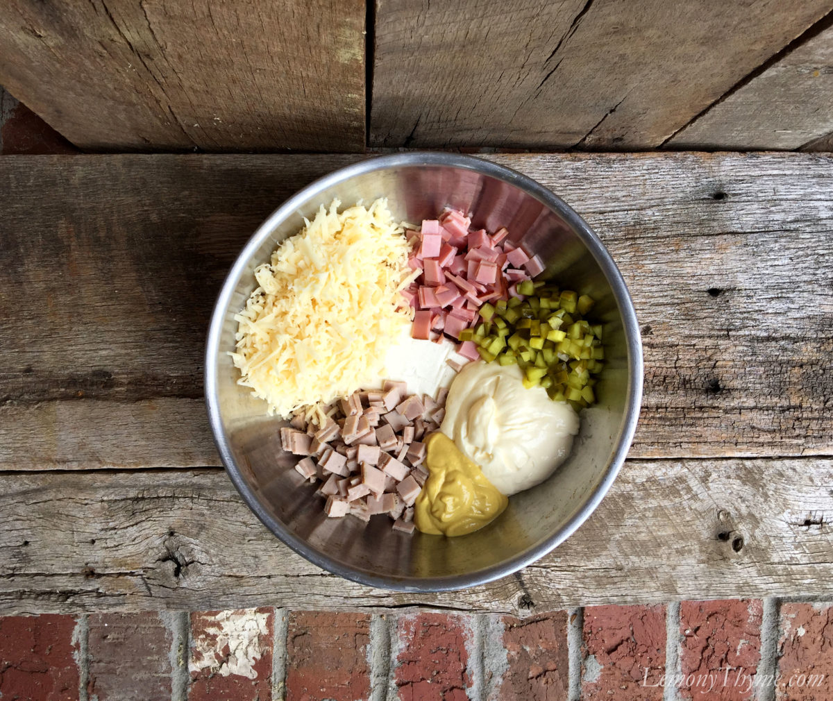 Ingredients: shredded Swiss cheese, diced sweet ham & Spanish pork (available at your deli-counter), chopped dill pickles, cream cheese, mayonnaise, mustard and fresh cracked black pepper. Mix it all up (I wore disposable gloves and went in with my hands – so much easier). Bake at 350 for 30 minutes or until golden on top and bubbly.