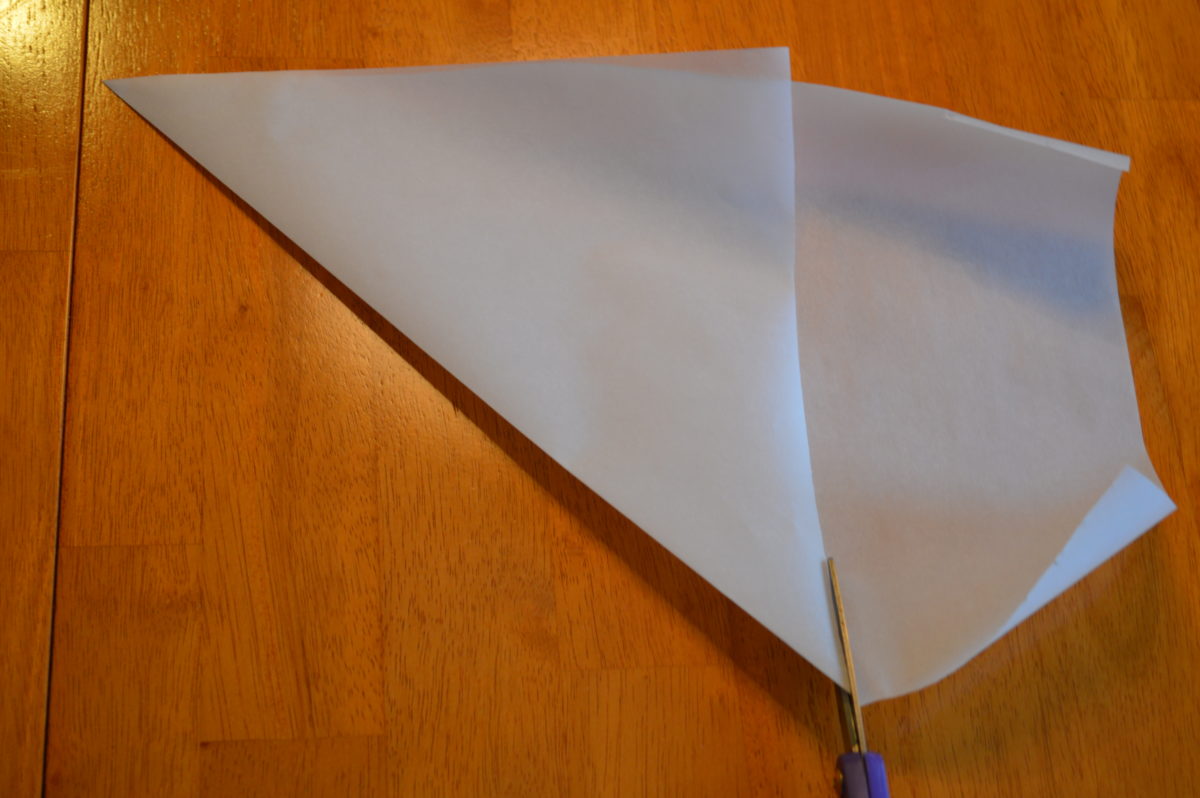 Step 4 ~ Turn your cake pan upside down and place the tip of the parchment paper in the center of your pan.  Mark the paper where the edge of the pan is and trim.
