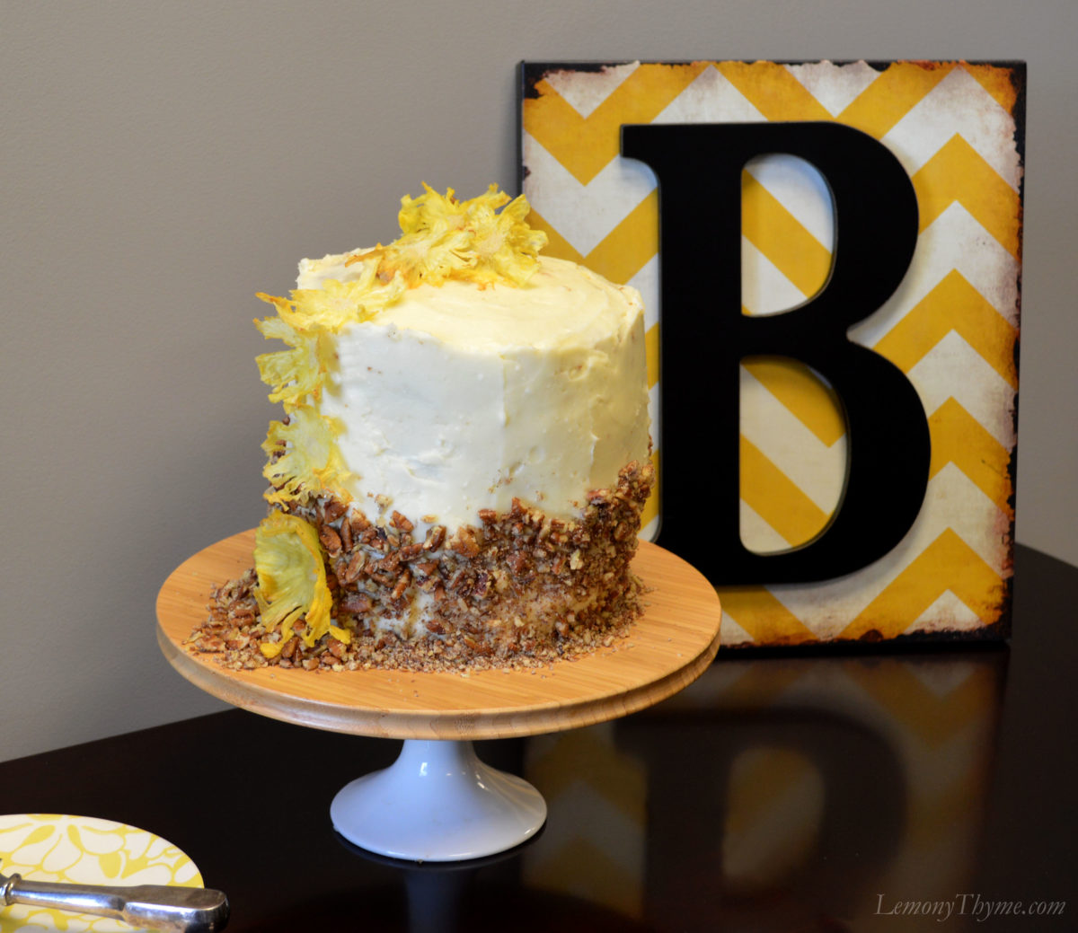 - Beat the cream cheese, butter and vanilla until creamy. Gradually add in the confectioners sugar; beat until smooth and creamy. Spread frosting between each layer, then spread remaining frosting on top and sides of cake. Press chopped pecans into frosting on lower half of cake. Arrange pineapple flowers in desired pattern.