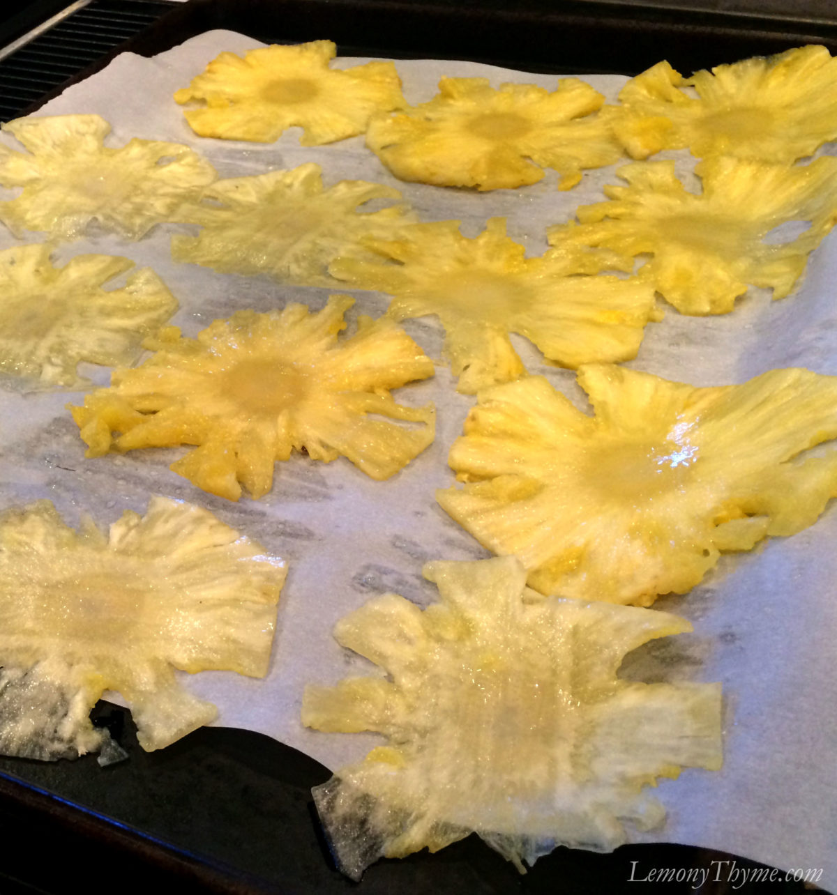 Recipe note: the instructions call for cutting the pineapple very thinly, so that it’s almost transparent. I attempted this first with my mandolin but I struggled to get full slices. I used a sharp knife and cut them as thin as I could. Not transparent but thin, which required a little extra time in the oven. Then they continued to air dry overnight.