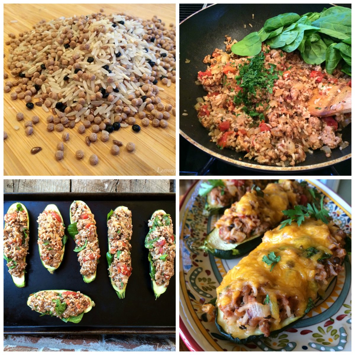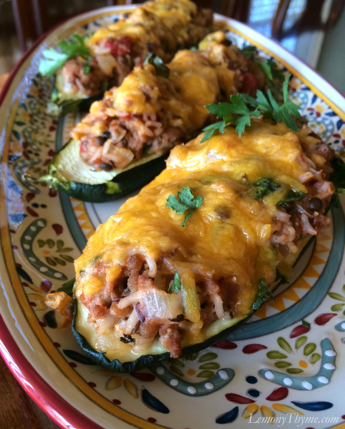 In addition to those two flavorful ingredients, I added diced tomatoes, sautéed onion, fresh spinach & parsley to our stuffing. While preparing the rice and stuffing, I got the zucchini off to a head start. About 15 minutes in the oven before stuffing will help insure they are tender when ready to serve. Once the prebaked boats are filled to the brim, top them with freshly grated cheddar cheese and return them to the oven for 30 minutes.