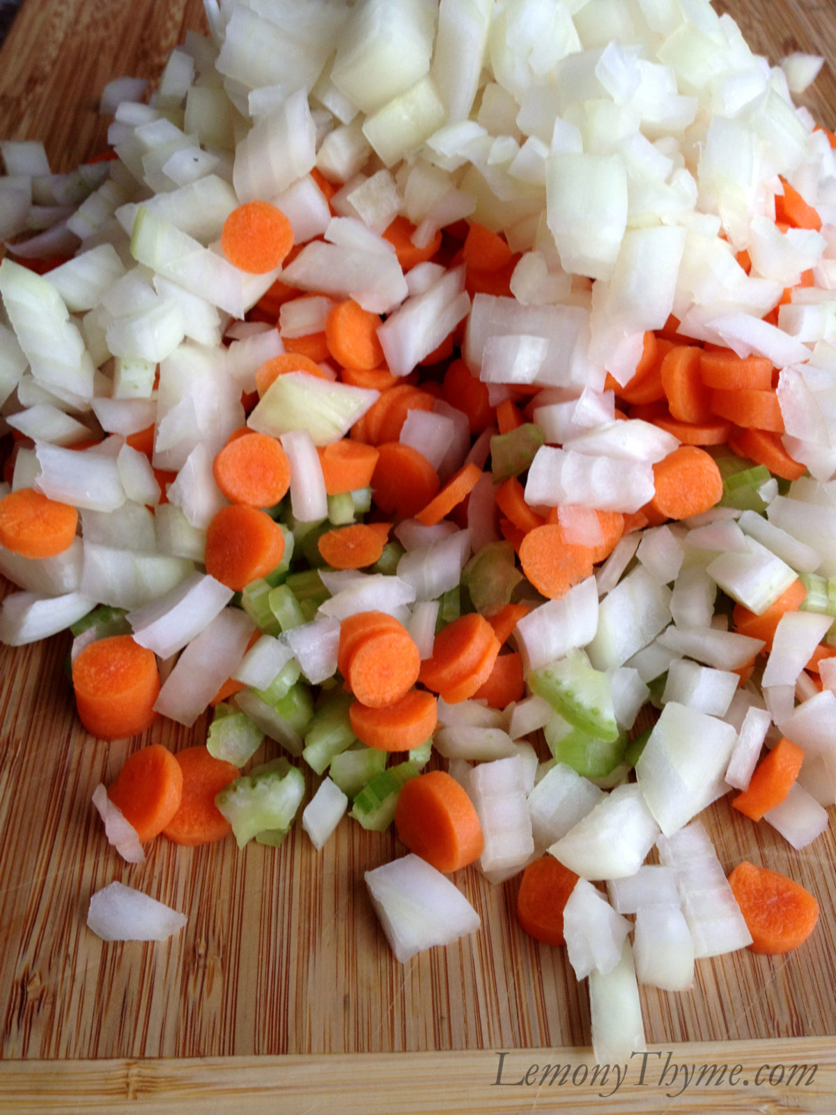 This soup, like many we make, starts with a classic mirepoix of diced celery, onion, and carrots sautéed in a little butter and olive oil with a nice fresh thyme sprig.