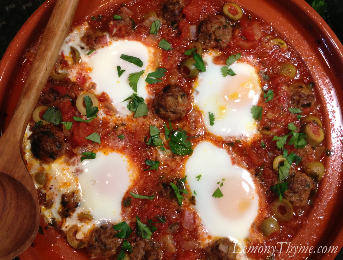 I wanted to share one more Winter Thyme Spice Exploration dish before I mentally checked into Spring. When I discovered Kefta Mkaouara, a traditional Moroccan tagine dish, it offered all the right components. Lovely spices, fresh herbs, wonderfully seasoned mini-meatballs, and poached eggs all slow cooked in glorious tomato and olive sauce in our new Tagine. Beautiful.