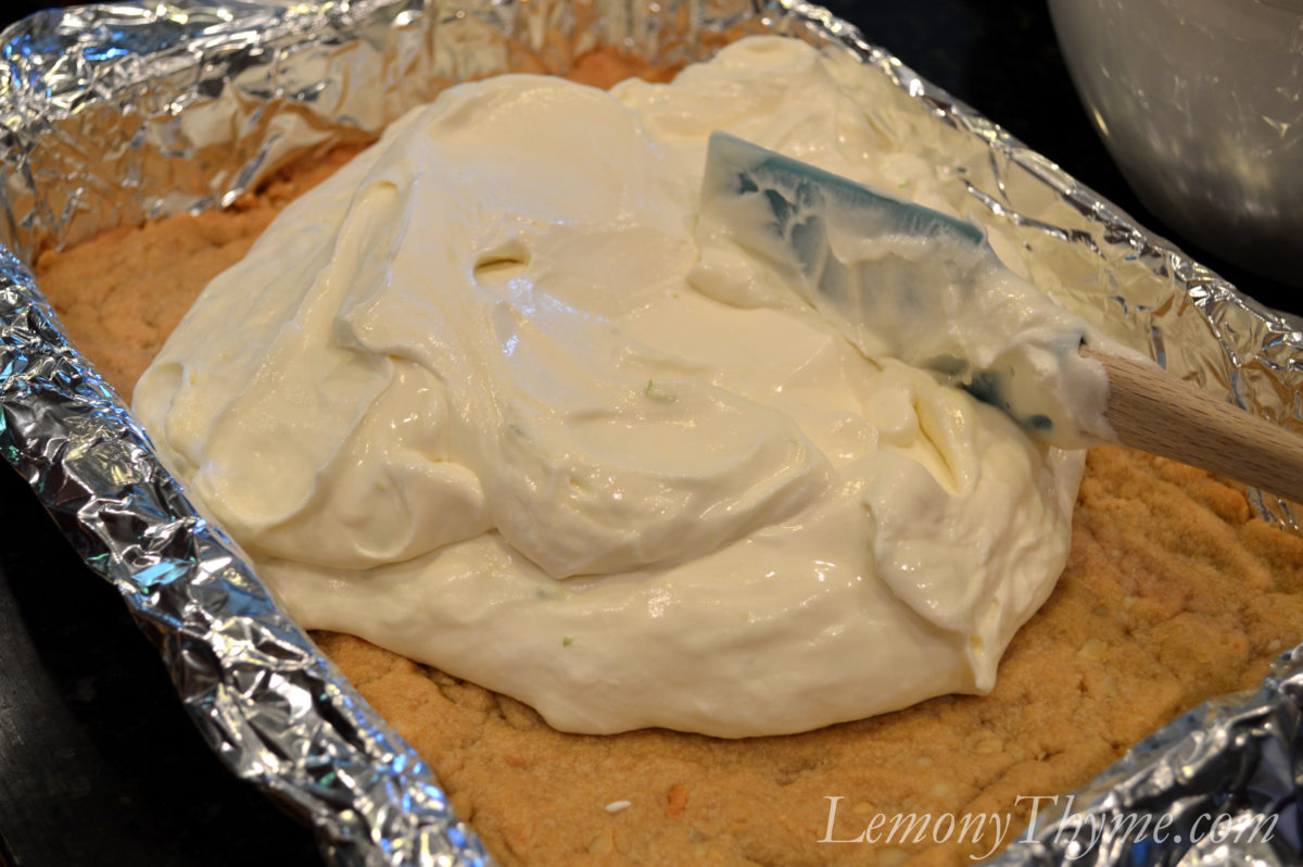 - Fold lime mixture into whipped cream. Pour evenly over baked crust, cover and chill 8 hours. Carefully lift foil out of pan. Cut dessert into diamond shapes or bars. Garnish.