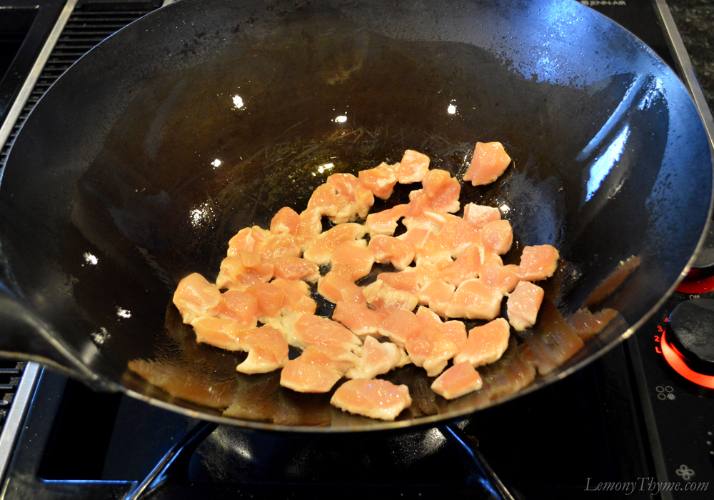 - Heat wok or heavy bottom pot over high heat. Add 1 Tbl. of peanut oil and marinated chicken. Stir-fry until chicken is golden brown, about 2-3 minutes or until cooked through. Remove from pan and reserve.