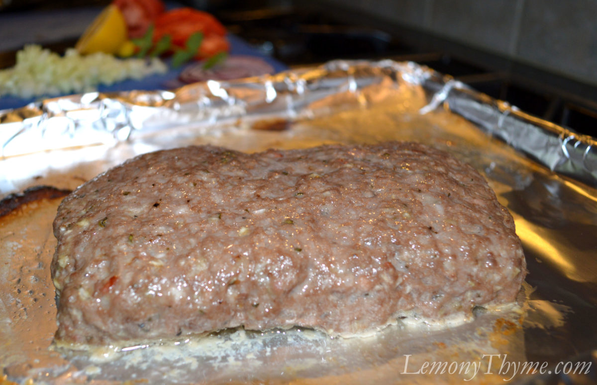 To prepare the Gyro meat, ground lamb is combined with fresh oregano, salt & pepper then chilled for at least an hour (or up to overnight). The chilled meat is then combined with and diced bacon, chopped onion, and garlic in the food processor. It’s quite a process, one that I will never doubt again after tasting the end result. No need to change a single thing.