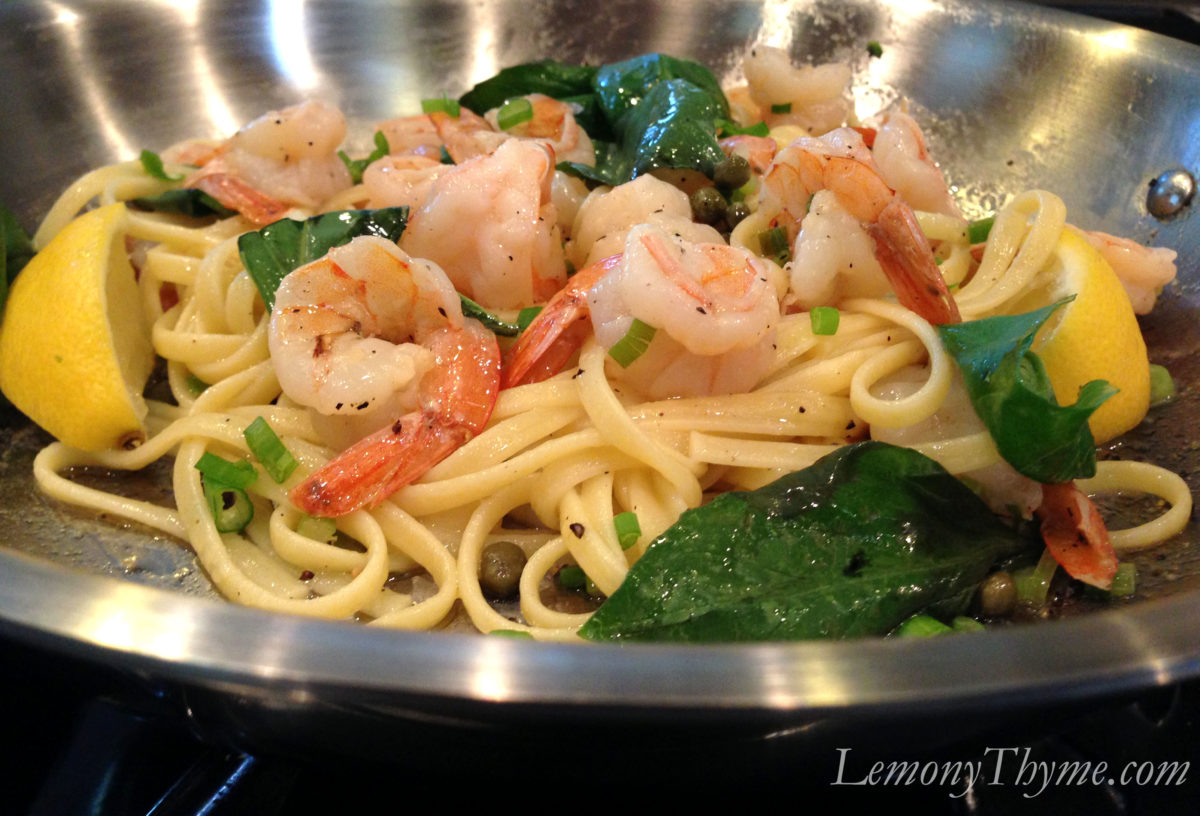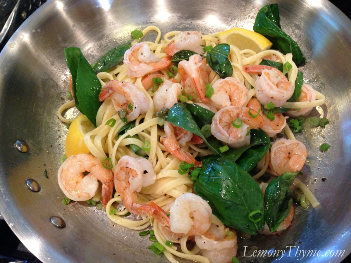 - Meanwhile, in a large sauté pan, melt butter and olive oil over medium-low heat. Add in shrimp, capers, lemon juice, and scallions. Sauté shrimp for 3-4 minutes until pink and no longer opaque. Remove from heat. Add in strained pasta and basil leaves, toss to coat. Season with salt & pepper to taste.