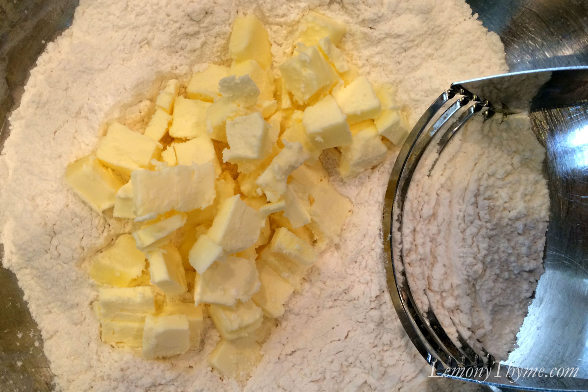- In a medium bowl whisk together the flour, sugar, baking powder and salt. Add in cubed butter and with a pastry blender combine until mixture is coarse and crumbly. Gently fold in the blackberries, lemon zest, and lemony thyme. Make a well in the center and reserve.