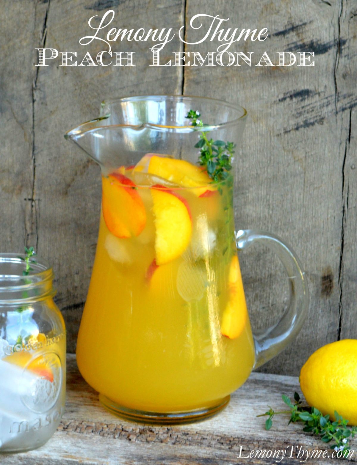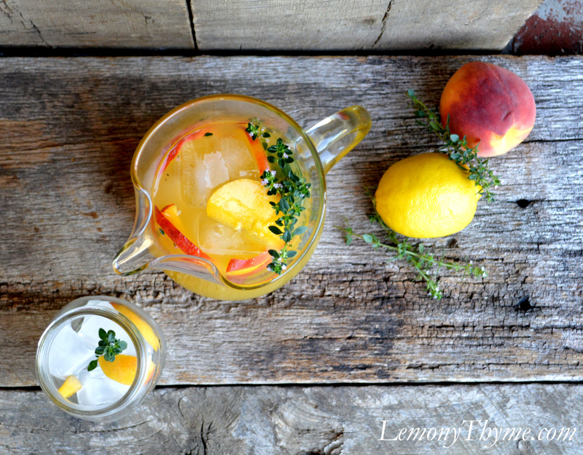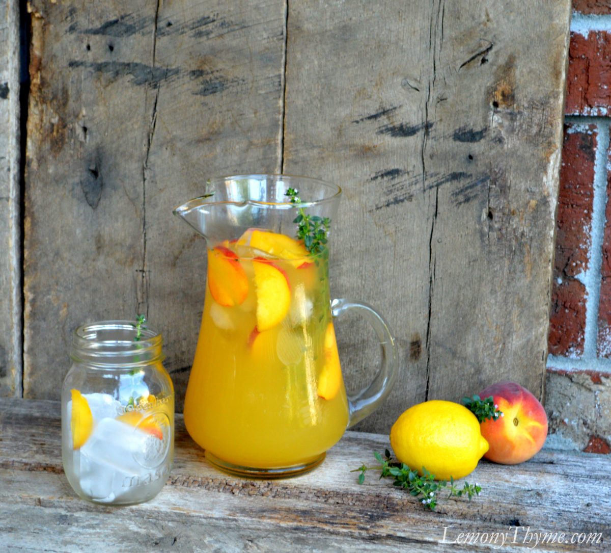 - In a large pitcher muddle lemony thyme sprigs with sugar. Add in lemon juice, peach nectar and cold water. Stir well until sugar is dissolved. Cover; chill.