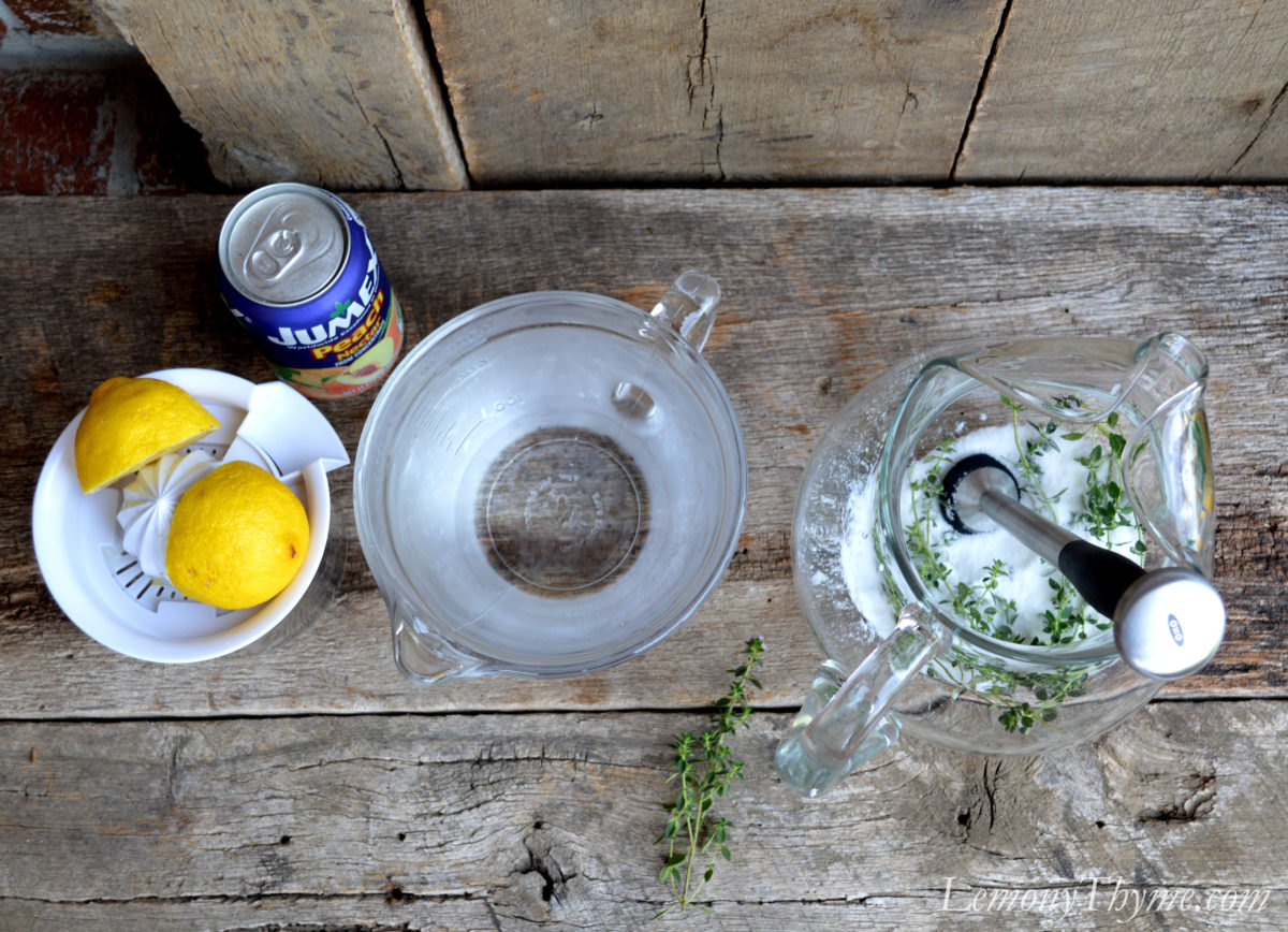In this case fresh lemony thyme is muddled with sugar before adding lemon juice, peach nectar, and cold water. The mixture then chills to perfection.