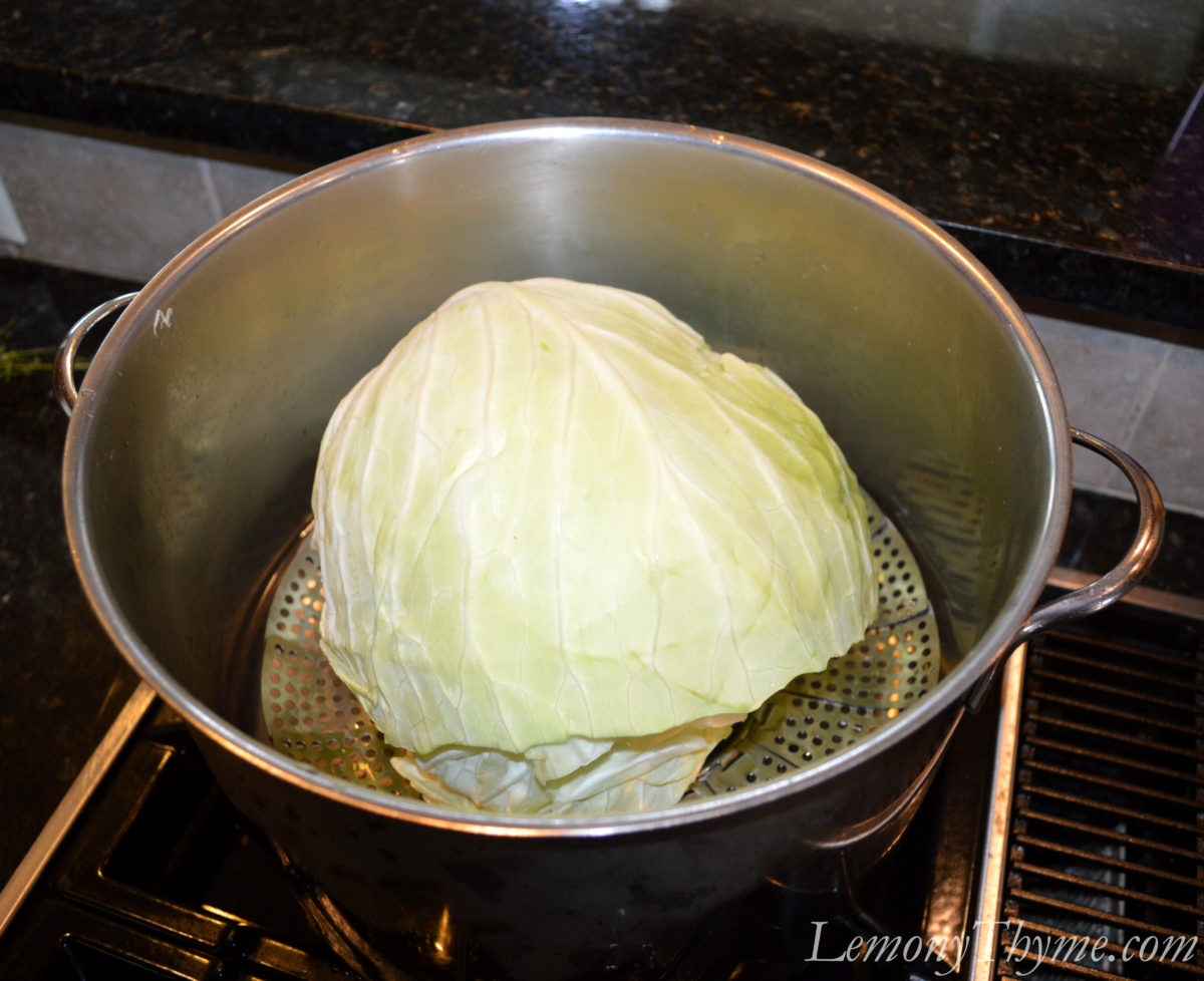 I cut the bottom off the cabbage, then gently loosened and peeled back what I thought was enough leaves (about 8). Should have done 12. I placed them over a steamer basket and steamed them over boiling water for about 10 minutes, until they were soft and pliable.