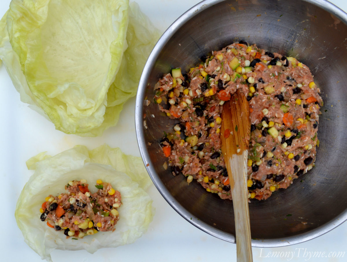I wanted to take the flavor in a Southwest direction, so the filling was a combination of sautéed veggies (onion, carrots, celery, garlic, zucchini, corn off the cobb), 1 cup of black beans (drained & rinsed), 1/2 cup uncooked long grain rice, 1/2 cup salsa, and 1 lb. raw ground turkey burger (omit for a vegetarian version). I added 1 egg white, 2 Tbl. Worcestershire, 3 Tbl. fresh cilantro, cumin, chili powder, dried oregano, salt & pepper.