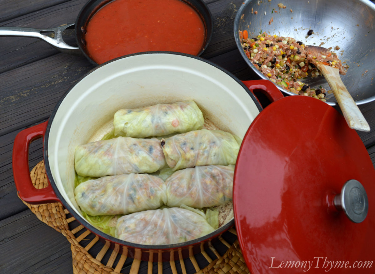 - Roughly divide mixture into 10 equal portions. Spoon each portion on a cabbage leaf and roll beginning at the stem end of the leave. Fold in sides as you loosely roll. Place seam side down in the Dutch oven. Once you have one layer of rolls spoon about 1/3 of the sauce over the rolls. Continue to add filled rolls in a 2nd layer, then cover with remaining sauce.