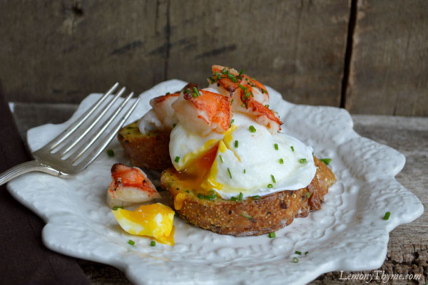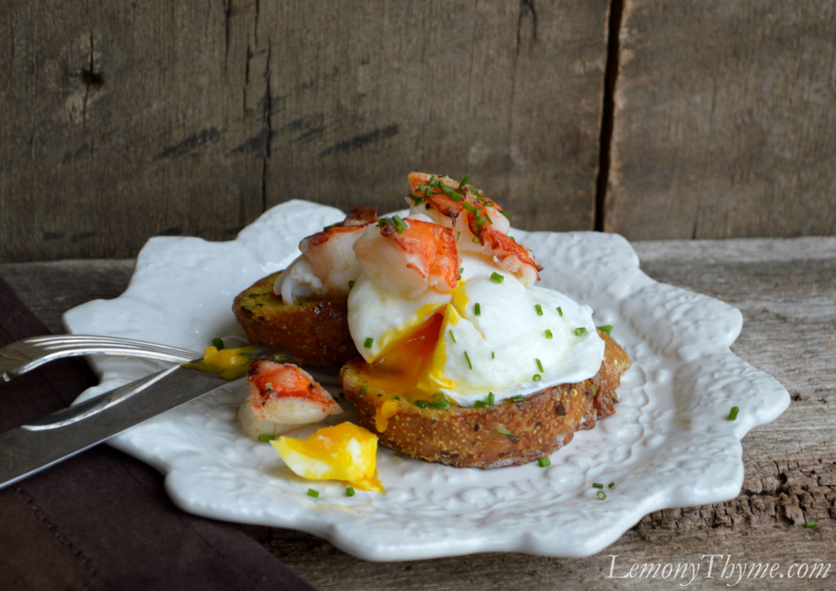 - To plate, place 2 savory French toast slices on each plate. Top with poached egg, lobster pieces, drizzle with melted butter, sprinkle with snipped chives, salt & pepper.