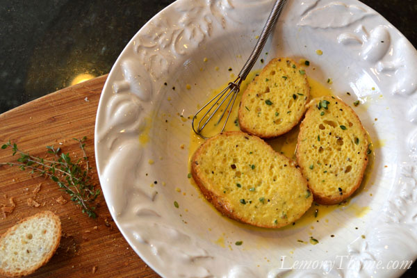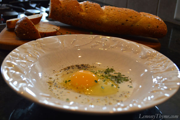 - Whisk together the egg, cream, herbs, salt & pepper in a shallow dish. Lay baguette slices in egg mixture and gently press down. Let sit for 5 minutes, turn slices over and allow to rest another 5 minutes. Repeat until all egg has been absorbed into bread slices.